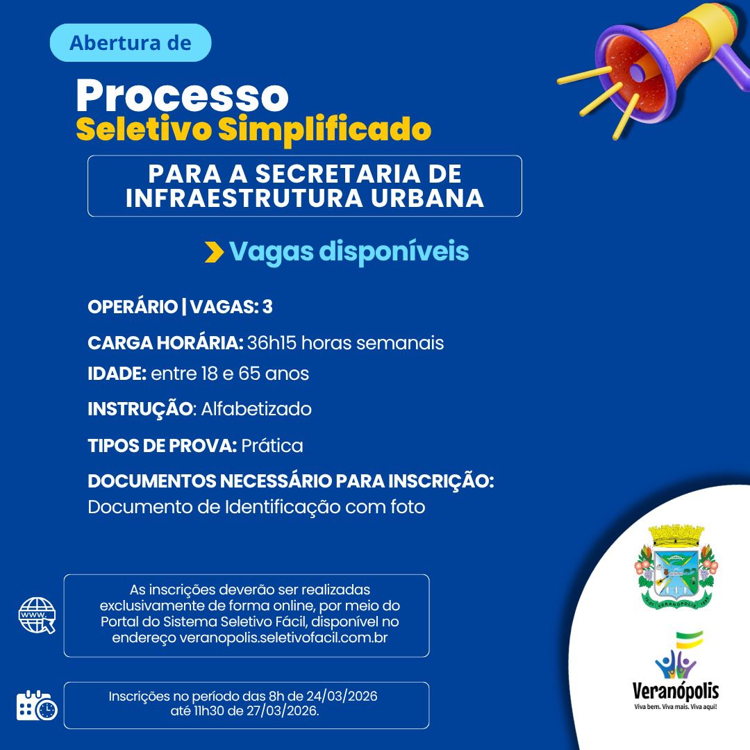 Estão disponíveis três vagas para o cargo de operário; as inscrições ocorrem exclusivamente de forma online entre os dias 24