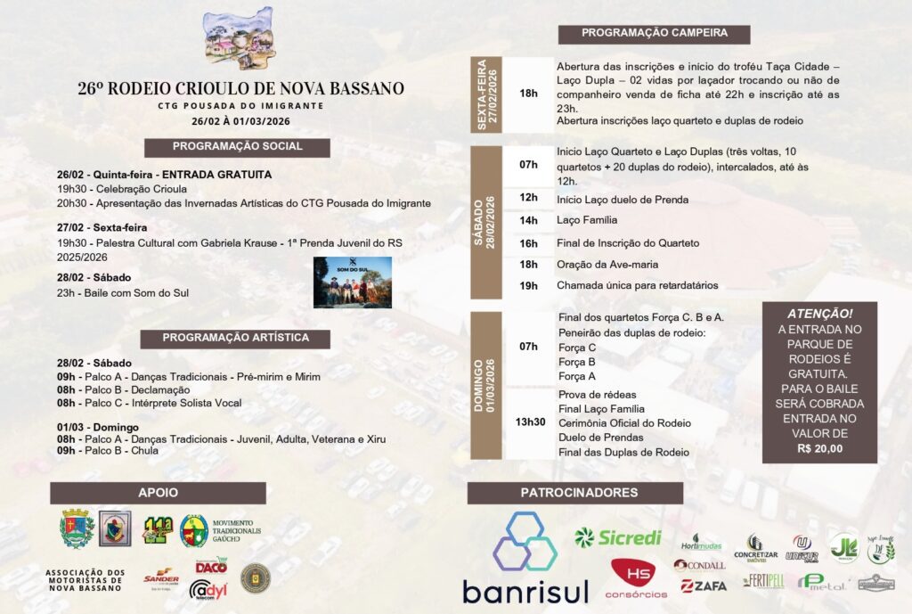 Inicia nesta quinta-feira, 26 de fevereiro, o 26º Rodeio Crioulo de Nova Bassano, promovido pelo CTG Pousada do Imigrante, no Centro Municipal de Eventos. A abertura oficial acontece às 19h30, com a tradicional Celebração Crioula, reunindo autoridades, tradicionalistas e a comunidade para marcar o começo de um dos principais eventos do calendário cultural do município.