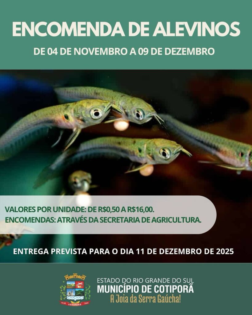 De 04 de novembro a 09 de dezembro, a Prefeitura de Cotiporã, através da Secretaria de Agricultura, Meio Ambiente, Indústria e Comércio, recebe as encomendas de alevinos.