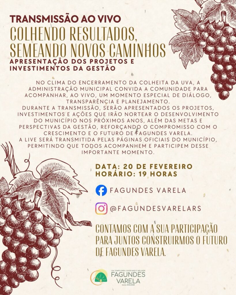 A Prefeitura de Fagundes Varela realiza nesta sexta-feira, 20 de fevereiro, às 19h, a transmissão “Colhendo Resultados, Semeando Novos Caminhos”. O objetivo é apresentar projetos, investimentos e ações previstos para os próximos anos.