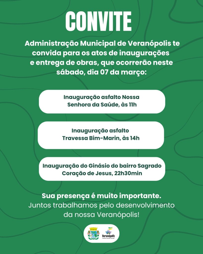 A Administração Municipal de Veranópolis convida a população para acompanhar uma série de atos oficiais de inauguração que ocorrerão neste sábado, dia 07 de março. As entregas simbolizam o avanço de projetos de mobilidade e lazer no município. A programação oficial seguirá o cronograma abaixo: As autoridades reforçam que a presença da comunidade é fundamental […]