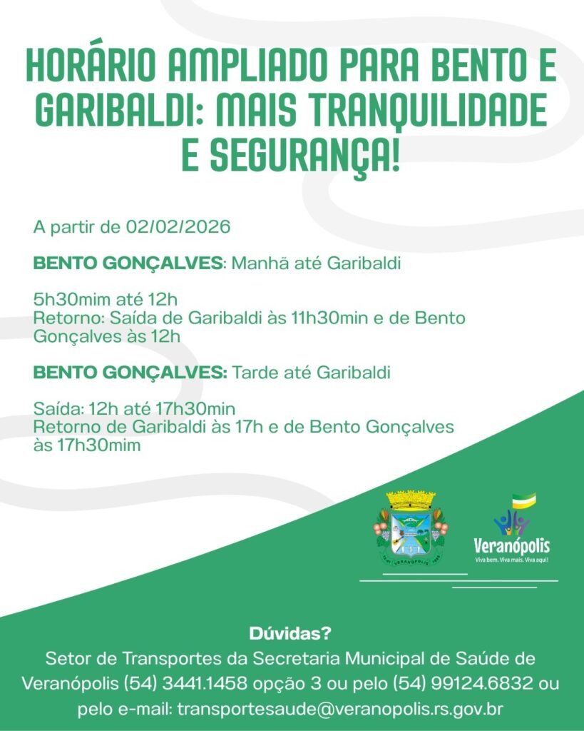 A Secretaria Municipal de Saúde de Veranópolis informa que, a partir do dia 02 de fevereiro, entram em vigor os novos horários do transporte de pacientes para Bento Gonçalves e Garibaldi, via Cotiporã. A mudança foi definida pelo Setor de Transportes com o objetivo de ampliar a pontualidade nos atendimentos, oferecendo mais tranquilidade e segurança […]