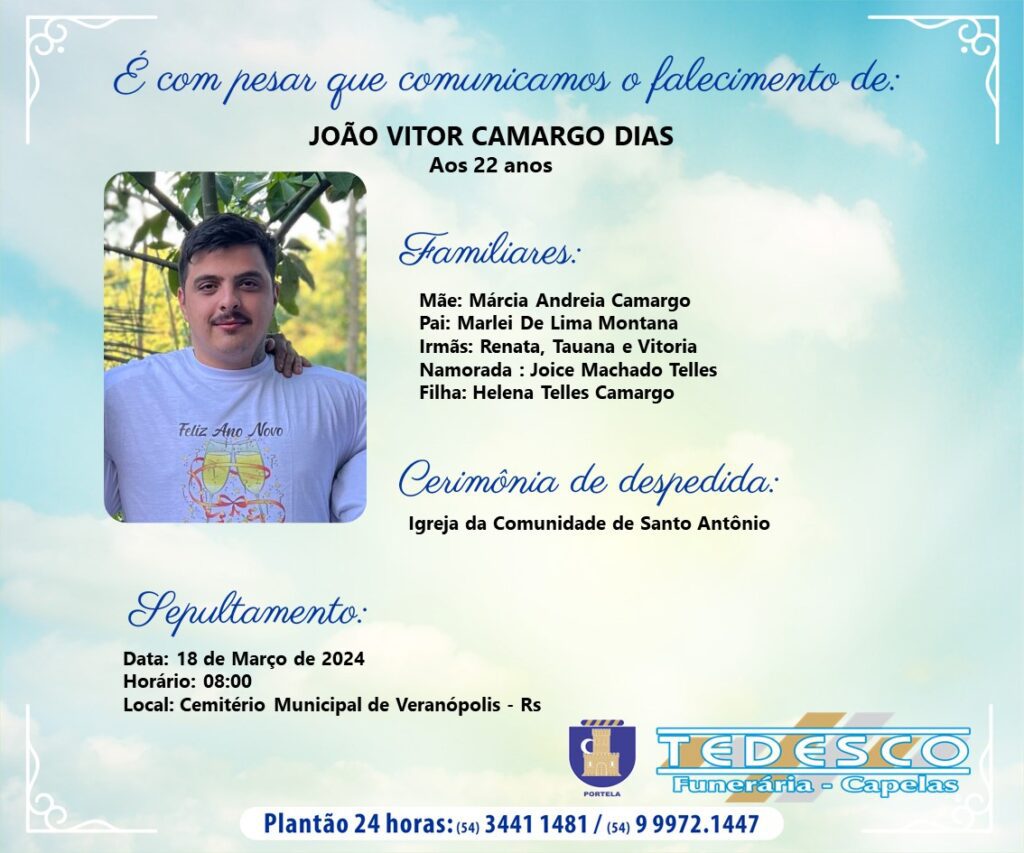 Será sepultado às 8h desta segunda-feira, dia 18, o corpo do jovem vítima de homicídio ocorrido em Veranópolis na madrugada deste domingo, dia 17. João Vitor Camargo Dias, de 22 anos, foi atingido por disparos de arma de fogo na saída de uma festa de formatura que ocorria na Sociedade AlfredoChavense (Soal). Ele estava no […]