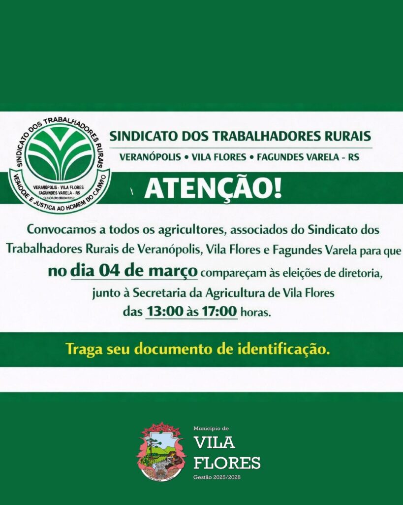 A Prefeitura de Vila Flores informa que o Sindicato dos Trabalhadores Rurais de Veranópolis, Vila Flores e Fagundes Varela realizará, no dia 04 de março, as eleições para a escolha da nova diretoria da entidade. A votação acontecerá junto à Secretaria da Agricultura de Vila Flores, no horário das 13h às 17h. A Administração Municipal […]