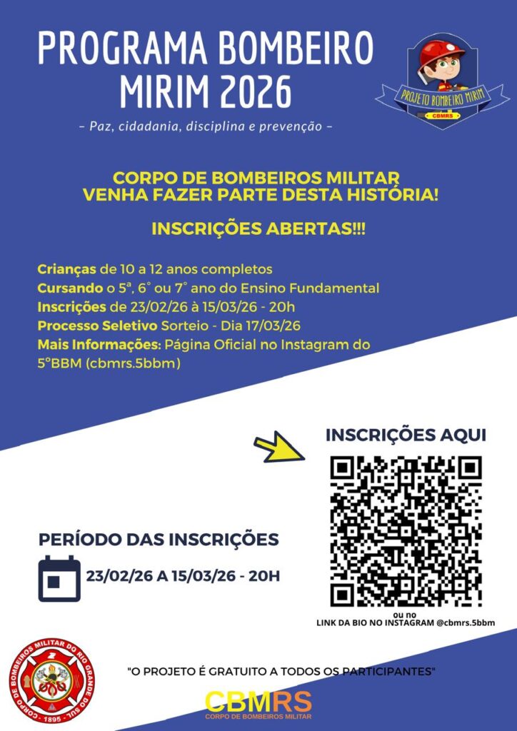 Já imaginou o seu filho aprendendo disciplina, noções de primeiros socorros e prevenção de incêndios com quem entende do assunto? O 5º Batalhão de Bombeiro Militar (5º BBM) anunciou a abertura das inscrições para o aguardado Programa Bombeiro Mirim 2026. O projeto, que já é tradição no Rio Grande do Sul, busca transformar crianças em […]