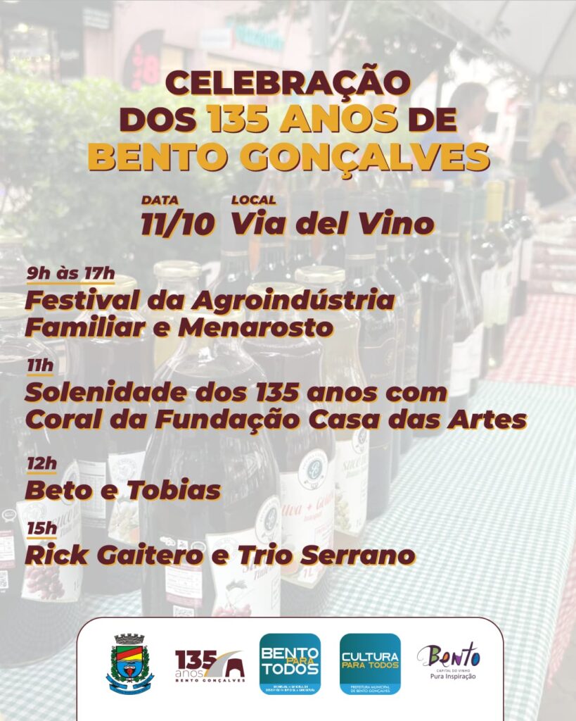 Neste sábado, dia 11 de outubro, Bento Gonçalves celebra seus 135 anos de emancipação com uma programação repleta de atrações na Via del Vino, no centro da cidade.