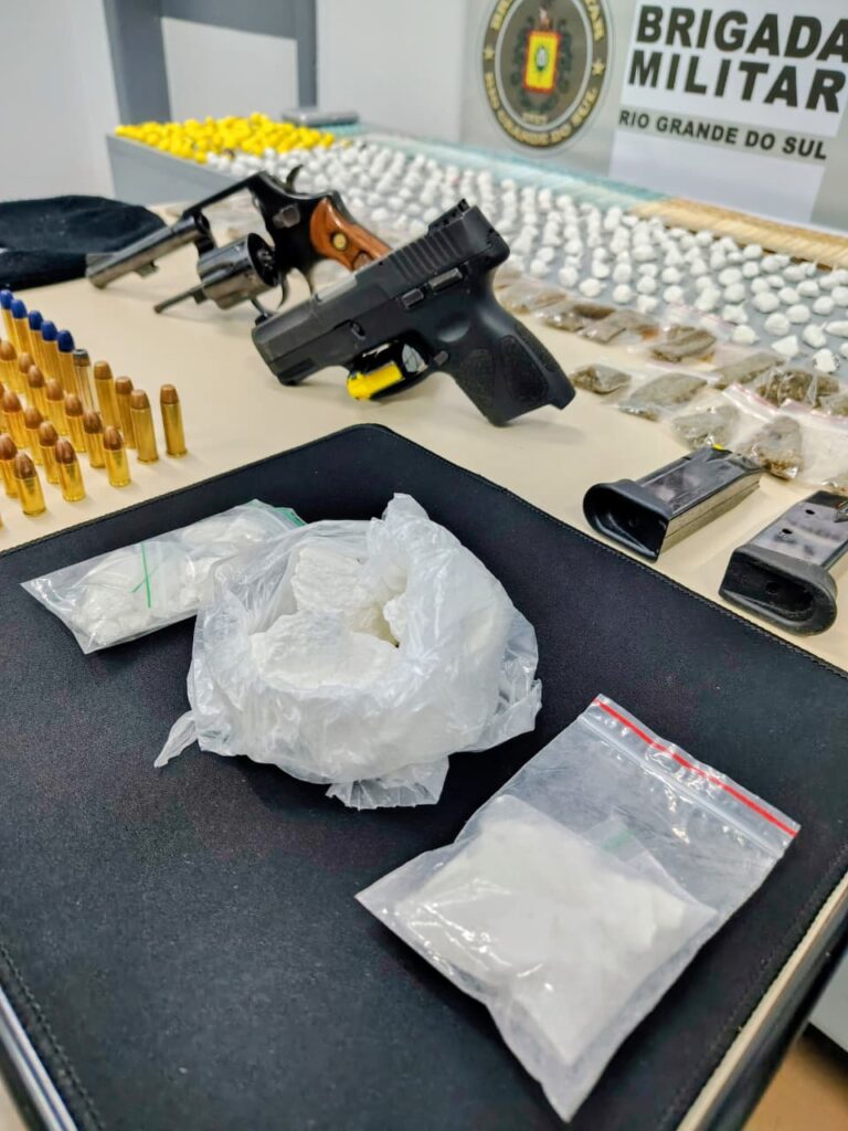 Em revista pessoal com um deles, foi encontrado um revólver calibre 38 carregado com seis munições, além de porções de cocaína; com o outro foram encontradas diversas porções de maconha. Ao total foram contabilizadas 294 porções (372 g), uma porção (115 g) de cocaína a granel, 29 porções (161 g) de maconha, 10 comprimidos de ecstasy e balança de precisão. Também foram apreendidos mais 2 carregadores de pistola, 31 munições no calibre 9mm, quatro munições no calibre 38, R$6.207 em espécie, quatro câmeras de videomonitoramento, uma balaclava, além de materiais para fracionamento da droga. O veículo e todo material foram apreendidos.