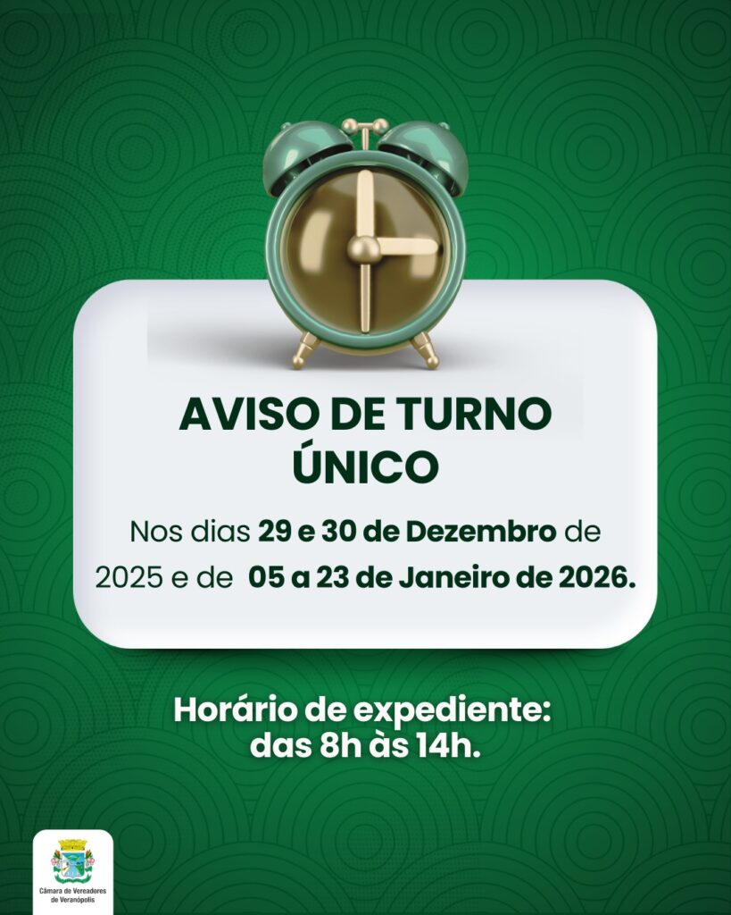 A Câmara Municipal de Vereadores de Veranópolis informa que, conforme o Decreto Legislativo nº 08, de 16 de dezembro de 2025, será adotado turno único de atendimento. A alteração ocorre nos dias 29 e 30 de dezembro de 2025 e no período de 05 a 23 de janeiro de 2026.