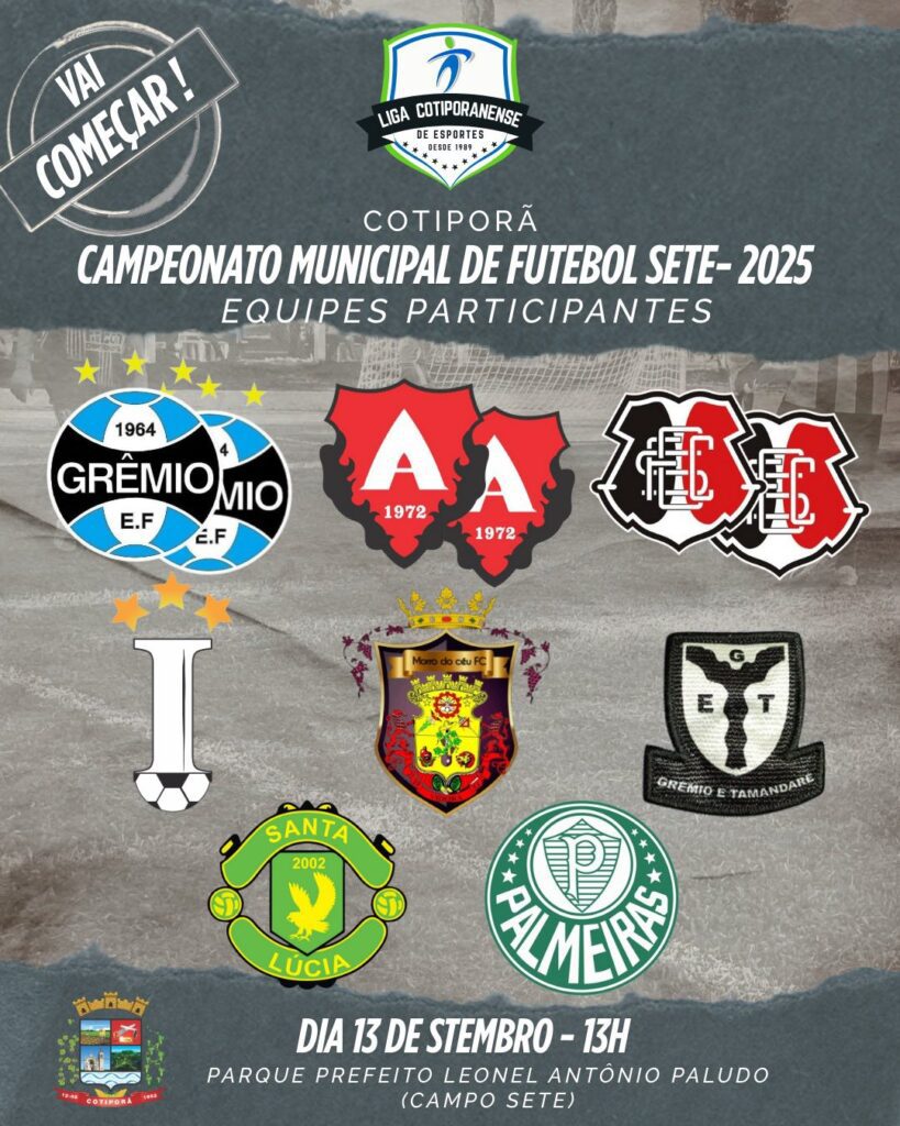 O Campeonato Municipal de Futebol Sete 2025 terá início no próximo sábado, 13 de setembro, em Cotiporã. A competição é organizada pela Liga Cotiporanense de Esportes com apoio da Prefeitura, por meio da Secretaria de Educação e Desporto.
