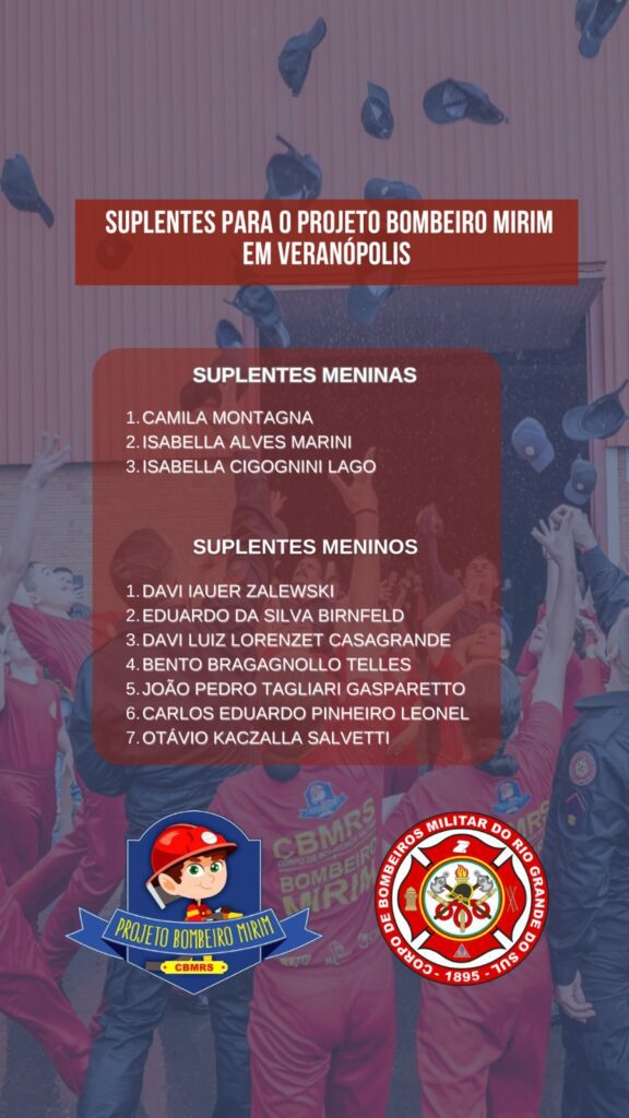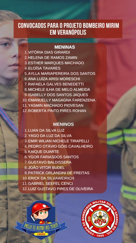 O Corpo de Bombeiros Militar do Rio Grande do Sul (CBMRS), através de sua unidade em Veranópolis, tornou pública a lista dos novos alunos convocados para o Projeto Bombeiro Mirim. A iniciativa, que é referência na formação de cidadãos e na promoção de valores como disciplina e prevenção, selecionou 12 meninas e 12 meninos para a turma deste ano.