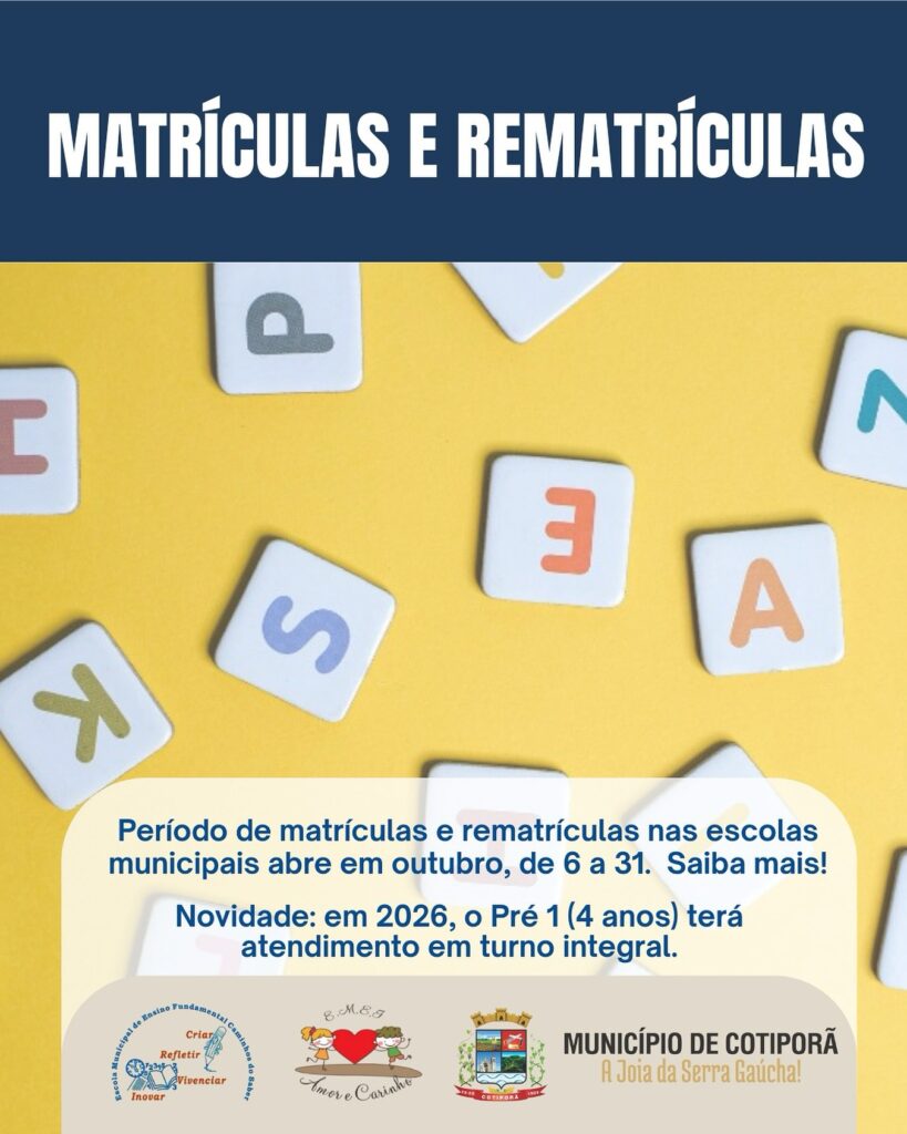A Prefeitura de Cotiporã, por meio da Secretaria Municipal de Educação e Desporto, informa que estão abertas as matrículas e rematrículas para o ano letivo de 2026 nas escolas municipais. O prazo será de 06 a 31 de outubro de 2025.