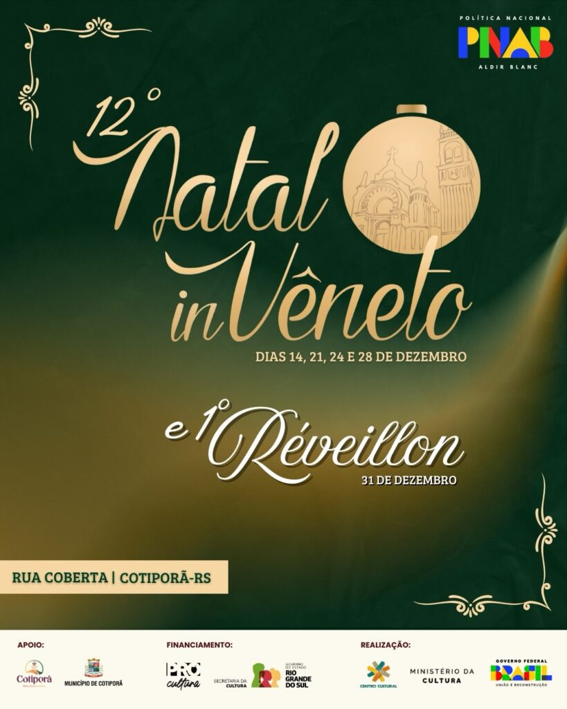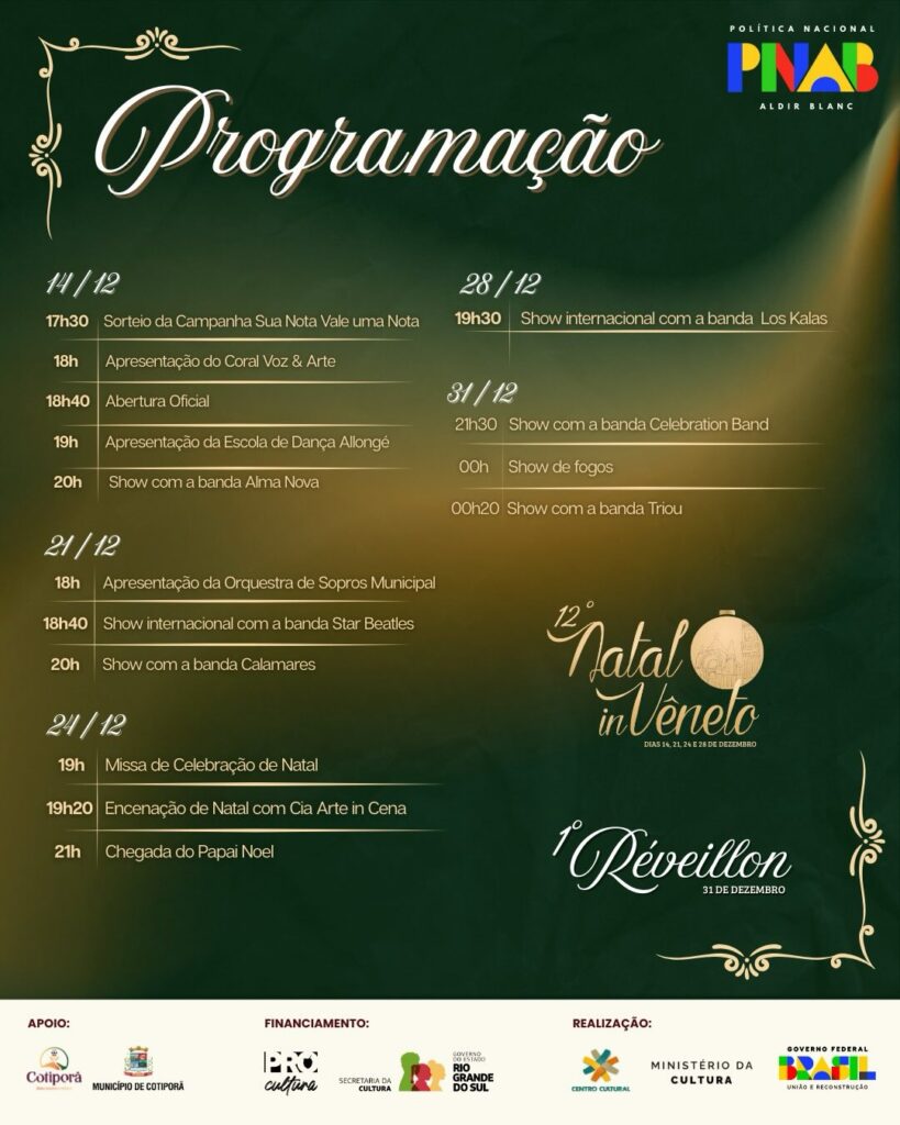 O período natalino em Cotiporã ganha um novo formato neste ano. Começa o 12º Natal in Vêneto, programação que reúne apresentações culturais, música e atividades comunitárias. A grande novidade é o Réveillon na praça, que será realizado pela primeira vez pelo município, com shows e espetáculo de fogos na virada do ano.