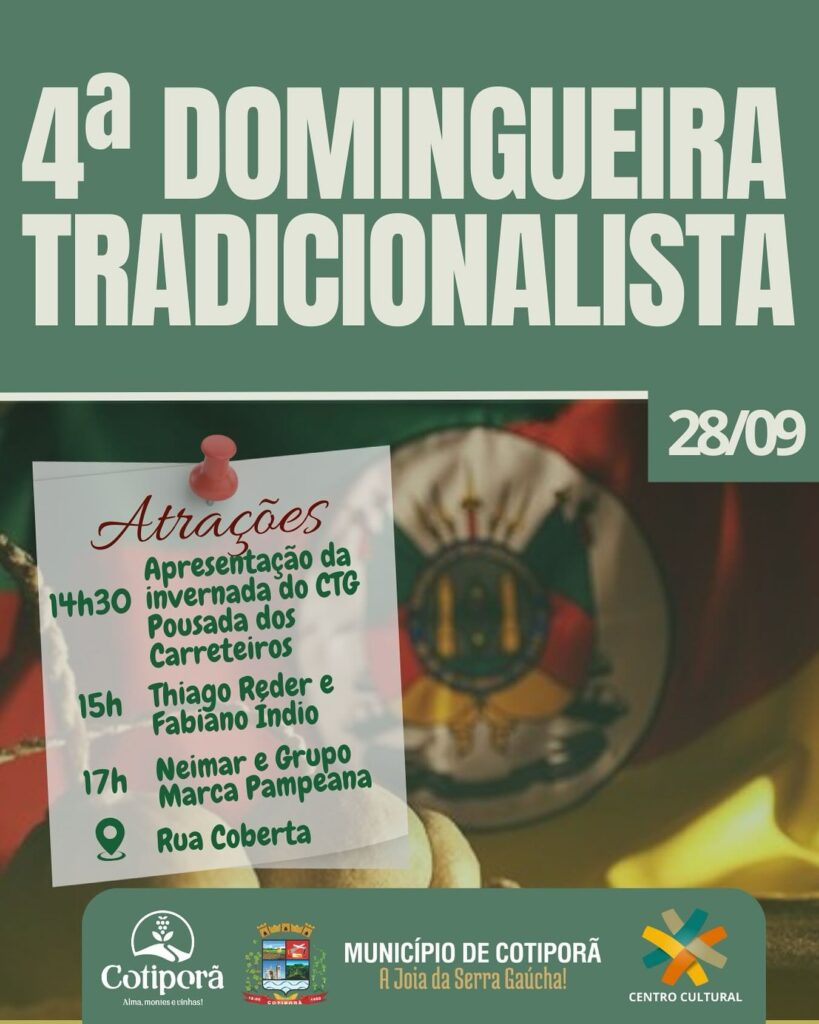 No domingo, dia 28 de setembro, Cotiporã será palco da 4ª Domingueira Tradicionalista, um encontro que promete celebrar o orgulho gaúcho e reunir a comunidade na Rua Coberta para uma tarde de música, dança e integração.