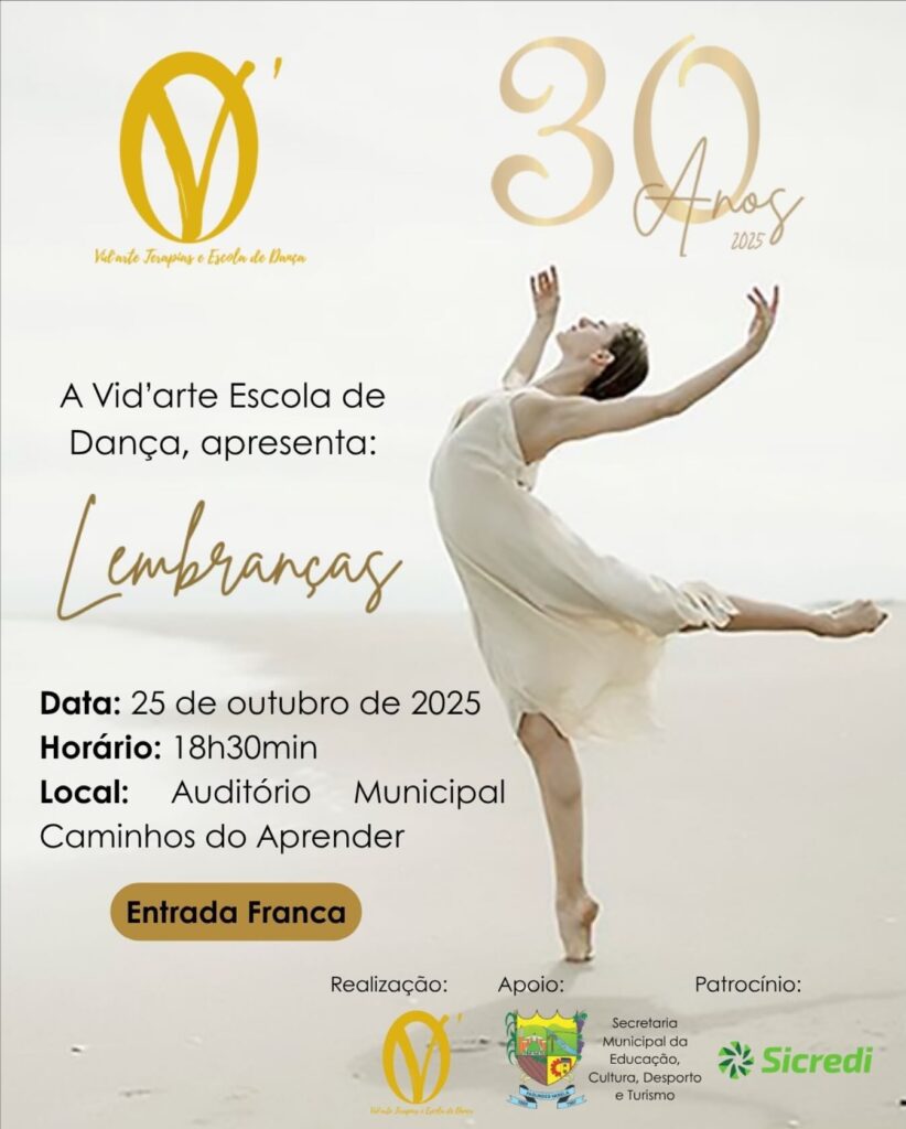 A arte e a emoção tomam conta do palco neste sábado, dia 25, com a apresentação do espetáculo “Lembranças”, promovido pela Vid’arte Escola de Dança, em Fagundes Varela. A apresentação acontece a partir das 18h30, no Auditório Municipal Caminhos do Aprender, com entrada franca. O evento faz parte das comemorações dos 30 anos da escola.