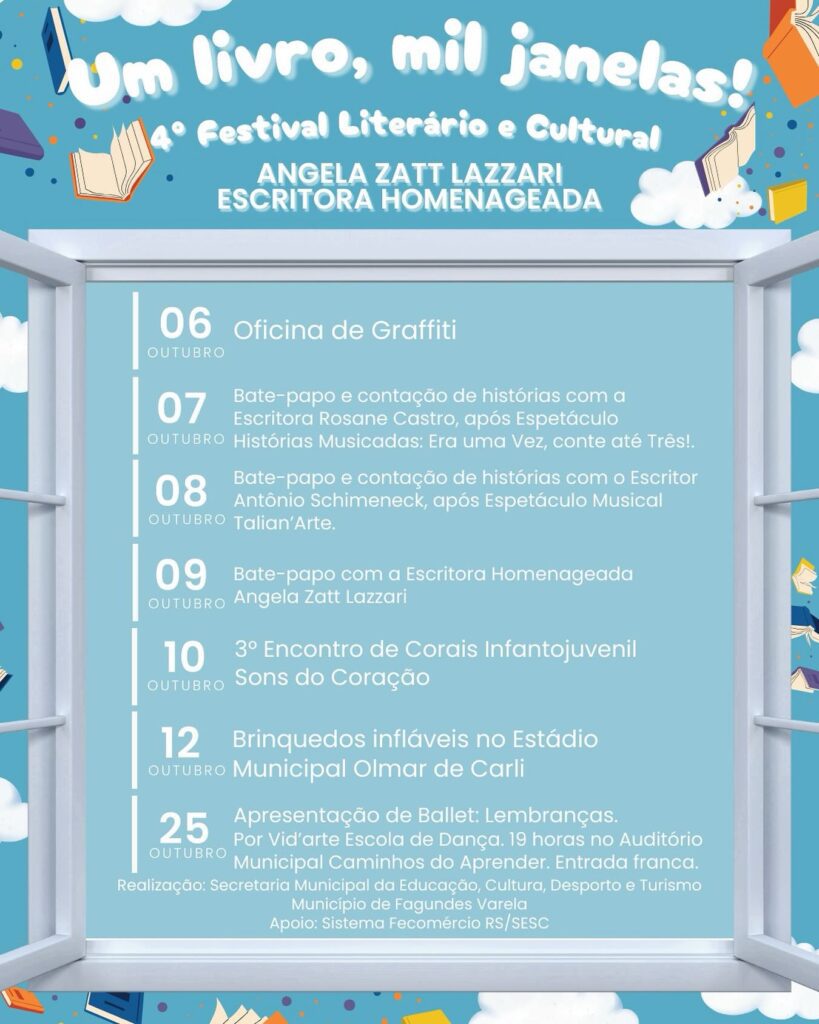 De 06 a 25 de outubro, Fagundes Varela viverá dias de muita cultura, aprendizado e diversão com a realização do 4º Festival Literário e Cultural – Um livro, mil janelas!. O evento promete movimentar a comunidade com uma programação variada que une literatura, música, arte e atividades para todas as idades. Nesta edição, a escritora Angela Zatt Lazzari será a grande homenageada, em reconhecimento à sua contribuição para a literatura.