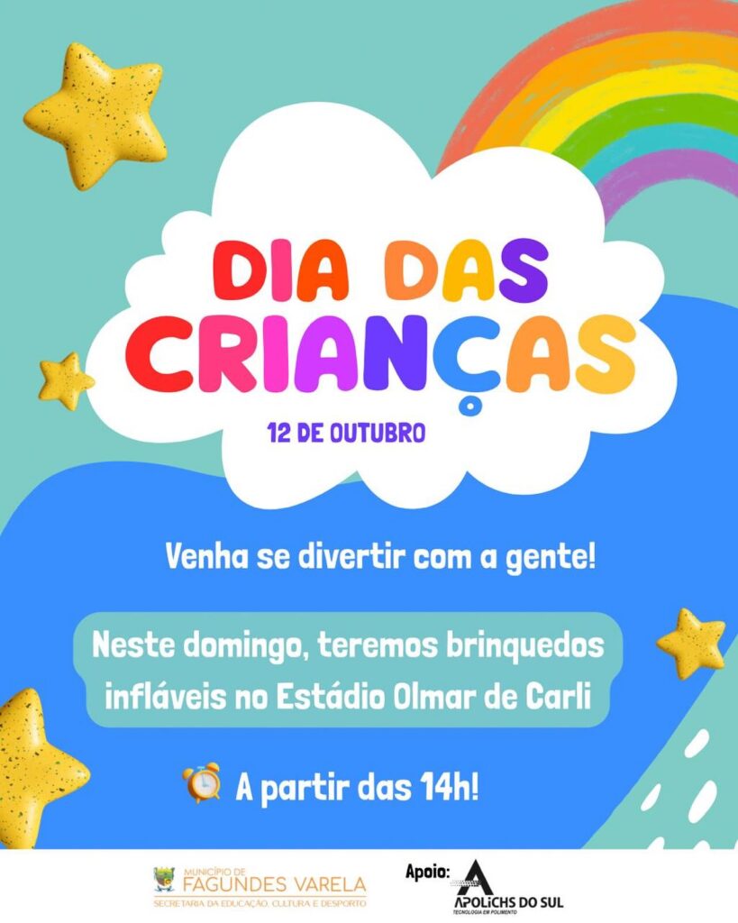 A Prefeitura de Fagundes Varela promove, neste domingo, dia 12, uma tarde especial em comemoração ao Dia das Crianças. A partir das 14h, o Estádio Olmar de Carli será palco de diversas atividades voltadas ao público infantil.