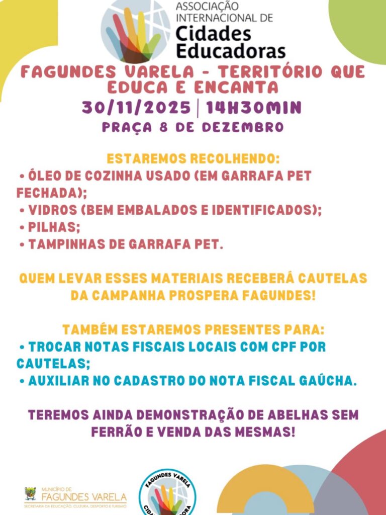 No próximo domingo, dia 30 de novembro, a partir das 14h30, a Praça 8 de Dezembro será palco de uma programação especial em comemoração ao Dia Internacional da Cidade Educadora. A atividade integra a campanha municipal que reforça o compromisso de Fagundes Varela com a educação integral, a sustentabilidade e a cidadania.