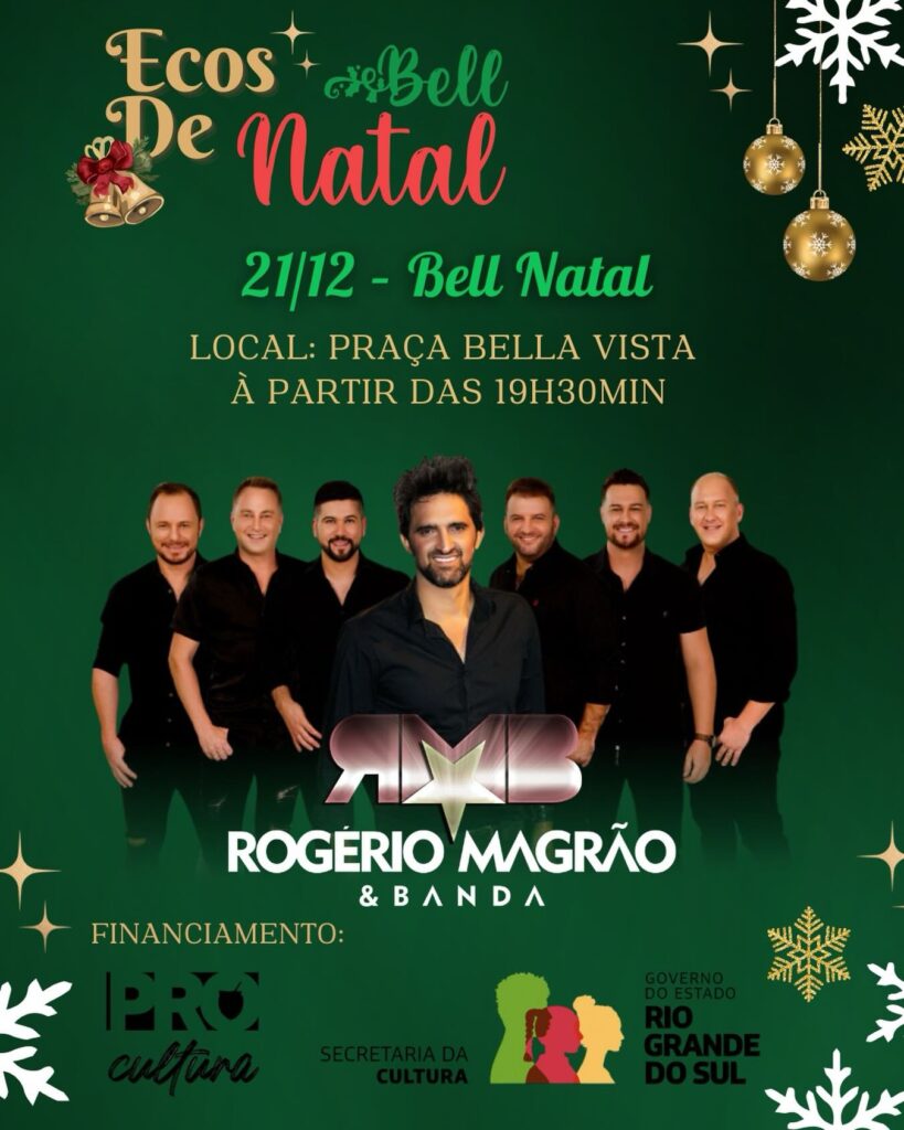 A magia do Natal vai tomar conta de Fagundes Varela neste domingo, 21 de dezembro, com a realização do evento Ecos de Natal – Bell Natal. A partir das 19h30, a Praça Bella Vista será palco de uma noite especial, aberta a toda a comunidade e pensada para reunir famílias em um clima de confraternização e celebração natalina. A atração será o show de Rogério Magrão & Banda.