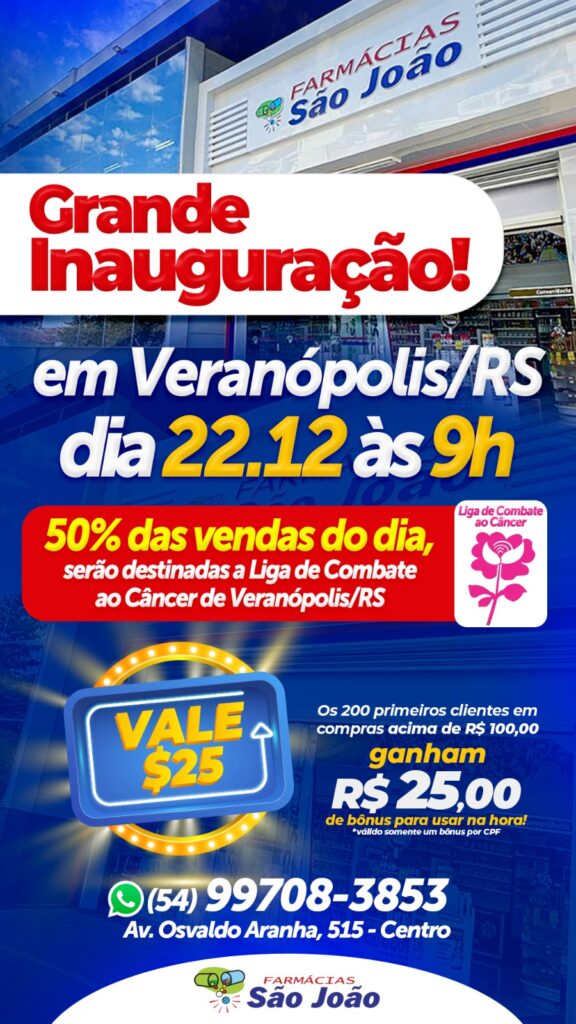 Para marcar a inauguração, a Farmácia São João promove uma ação especial nesta segunda-feira, dia 22. Durante todo o dia, 50% do valor das vendas será destinado à Liga de Combate ao Câncer de Veranópolis, reforçando o compromisso social da rede com a comunidade. Além disso, os 200 primeiros clientes que realizarem compras acima de R$ 100,00 receberão um bônus de R$ 25,00 para utilização imediata, conforme regulamento da promoção.