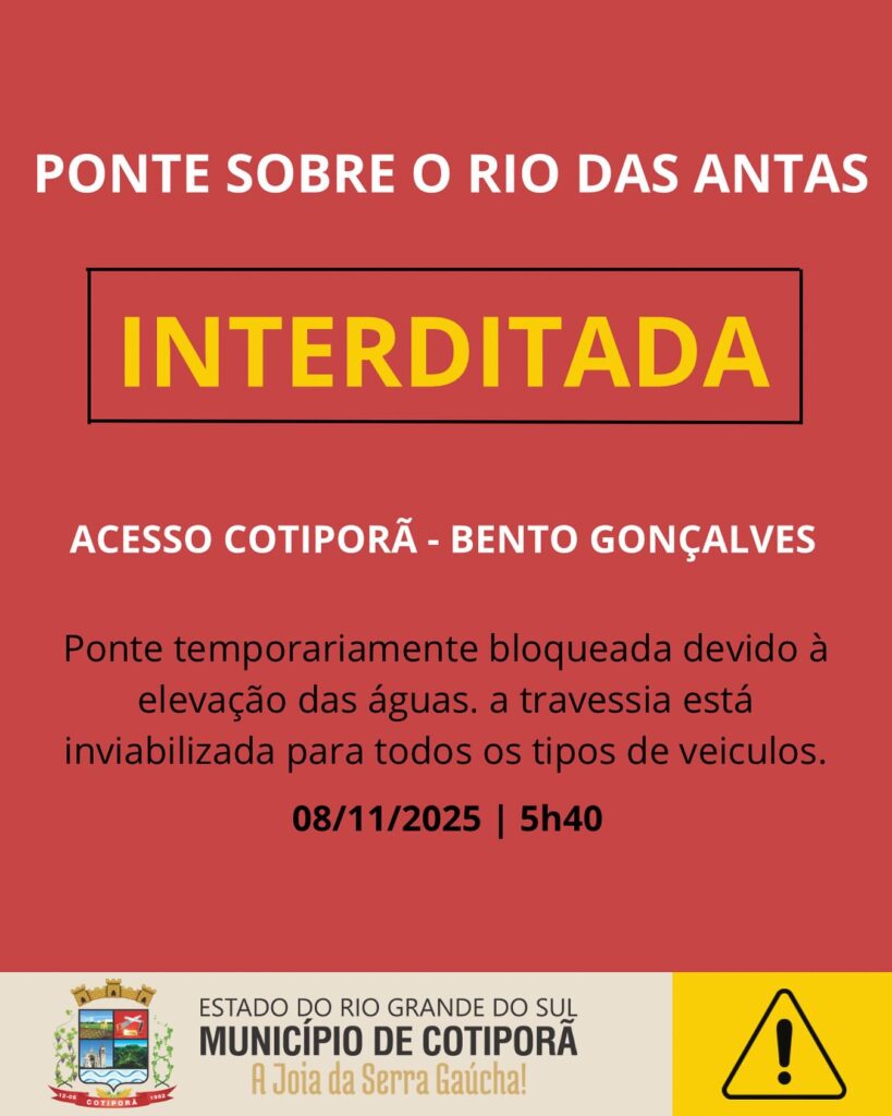A ponte sobre o Rio das Antas, que conecta os municípios de Cotiporã e Bento Gonçalves, está interditada temporariamente devido à elevação do nível das águas. A medida foi tomada pelas autoridades locais para garantir a segurança dos condutores e pedestres, já que a travessia se tornou insegura e impraticável para qualquer tipo de veículo.