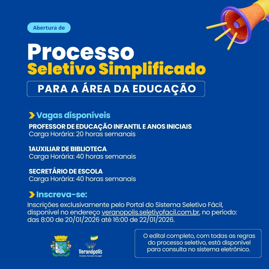 A Prefeitura de Veranópolis publicou o Edital nº 11, de 19 de janeiro de 2026, que dispõe sobre a abertura de Processo Seletivo Simplificado para contratação de profissionais em diferentes áreas da educação.