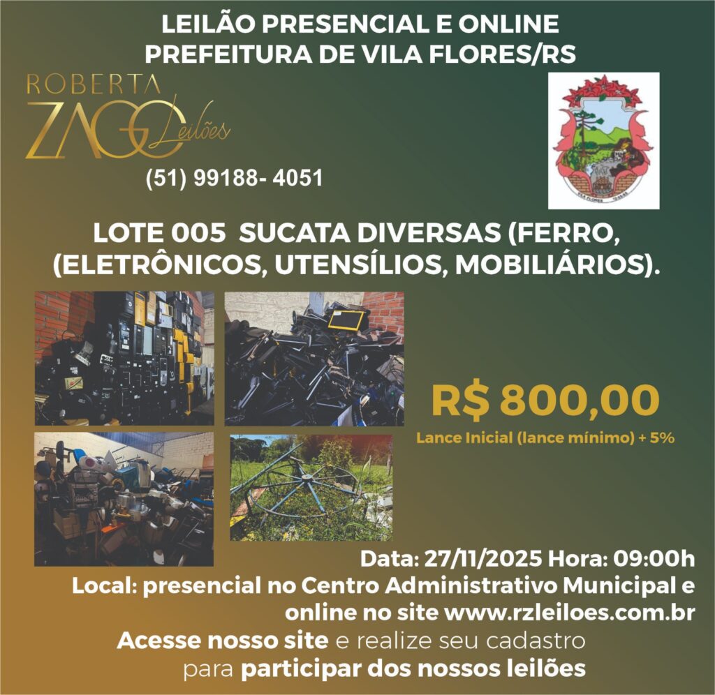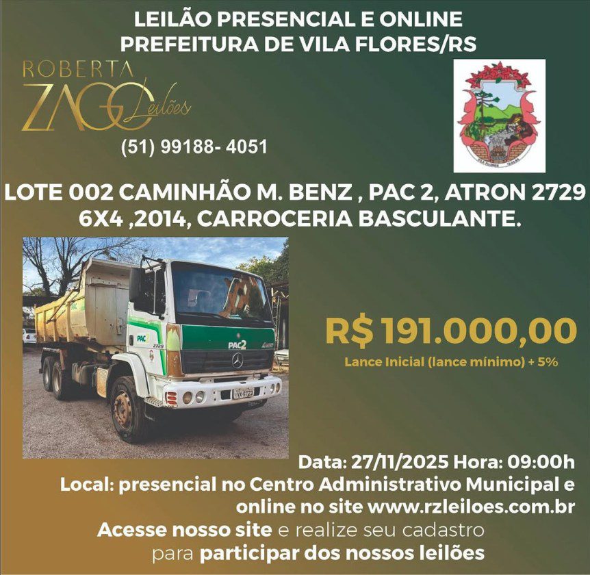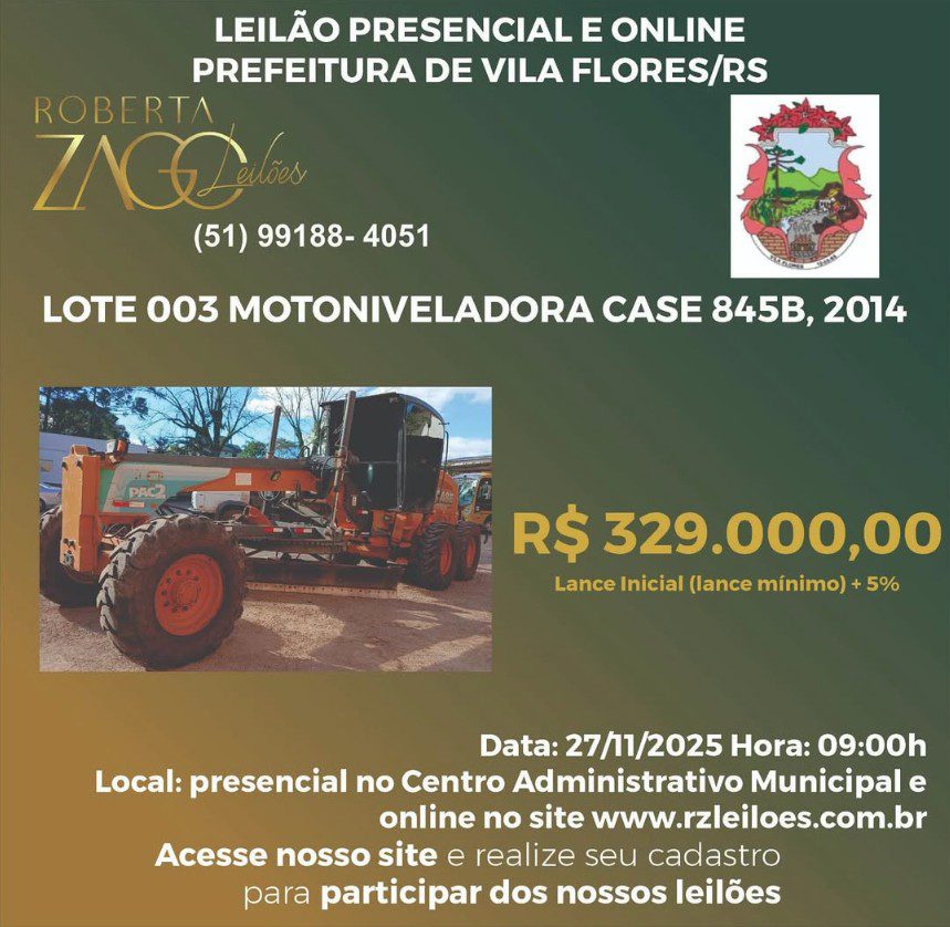 A Prefeitura de Vila Flores promoverá um leilão público presencial e online no dia 27 de novembro de 2025, a partir das 9h. O evento ocorrerá no Centro Administrativo Municipal e simultaneamente pela internet, através do site www.rzleiloes.com.br.