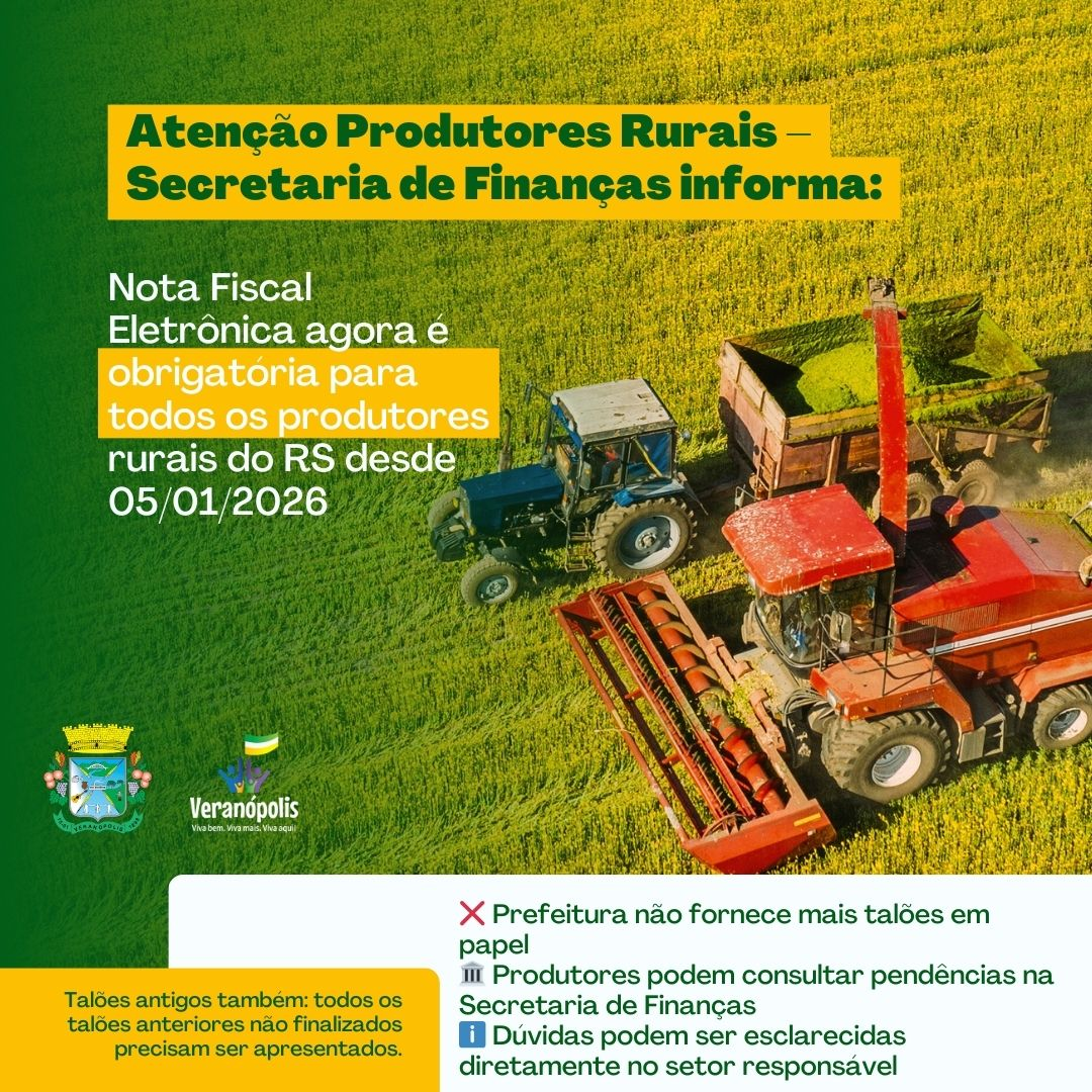 Desde a última segunda-feira, dia 05 de janeiro de 2026, todos os produtores rurais do Estado do Rio Grande do Sul passaram a ser obrigados a emitir notas fiscais eletrônicas em todas as suas operações. Em virtude dessa mudança, a Prefeitura de Veranópolis não fornecerá mais talões de notas fiscais em papel.