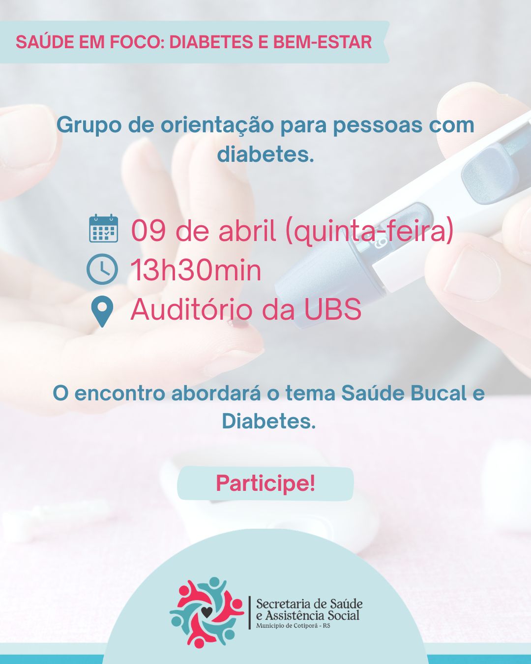 A Secretaria de Saúde e Assistência Social de Cotiporã convida a comunidade para o 2º encontro do grupo de orientação voltado a pessoas com diabetes. O evento será realizado no dia 09 de abril, às 13h30min, no Auditório da UBS.