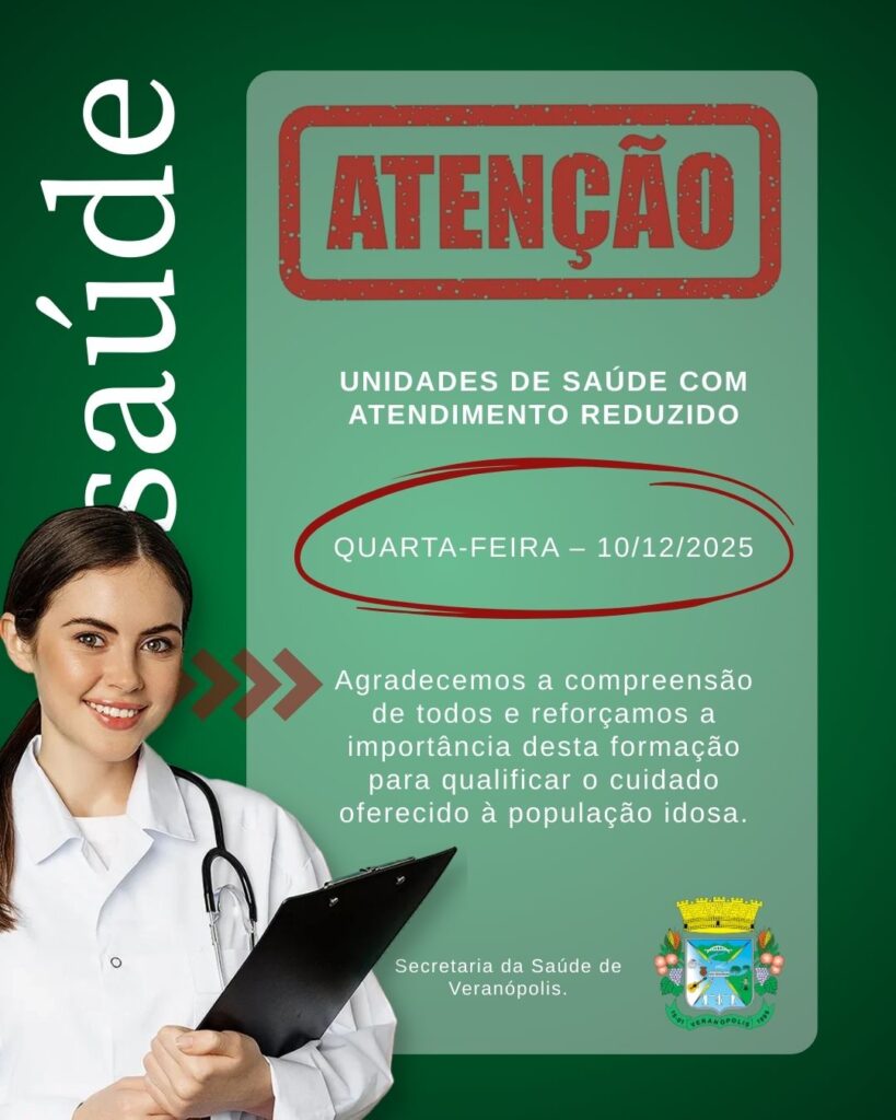 A Secretaria Municipal de Saúde de Veranópolis comunica que, nesta quarta-feira, dia 10 de dezembro, será realizada uma capacitação direcionada aos profissionais das equipes de Atenção Básica, ministrada pela médica geriatra Joana Ferrari.