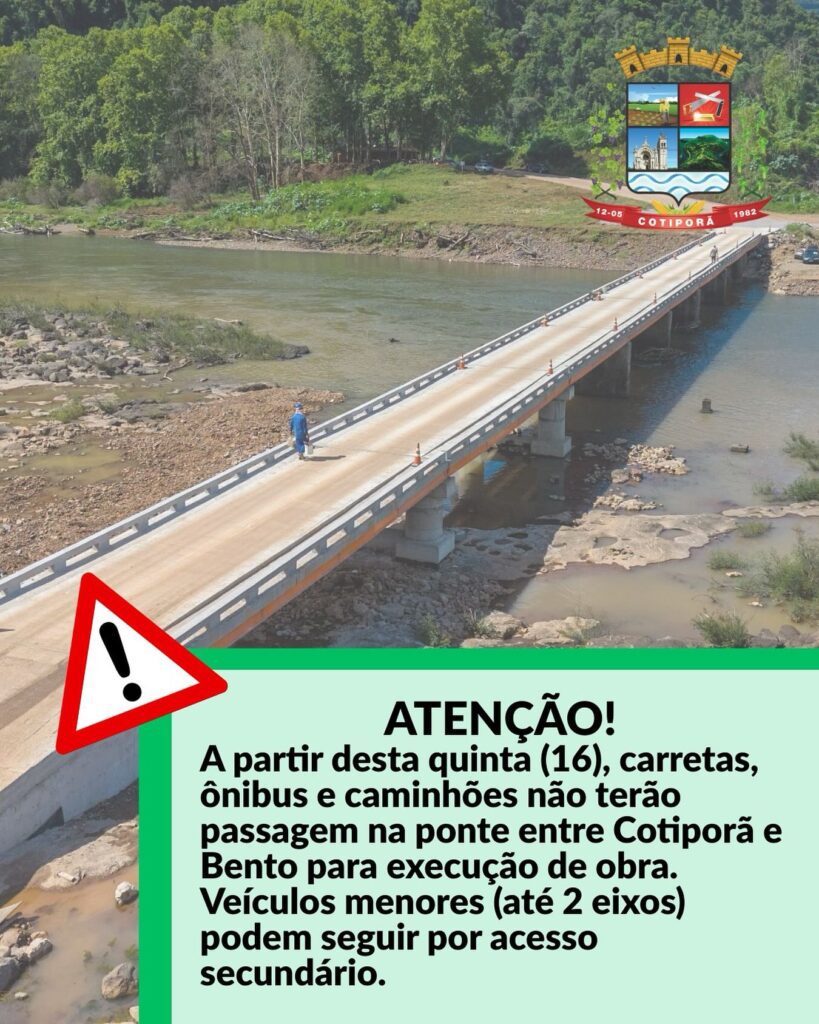 A partir desta quinta-feira, dia 16, carretas, caminhões e ônibus estão proibidos de trafegar pela ponte que liga Cotiporã a Bento Gonçalves. A medida é necessária devido às obras no acesso do lado de Faria Lemos, em território bento-gonçalvense.