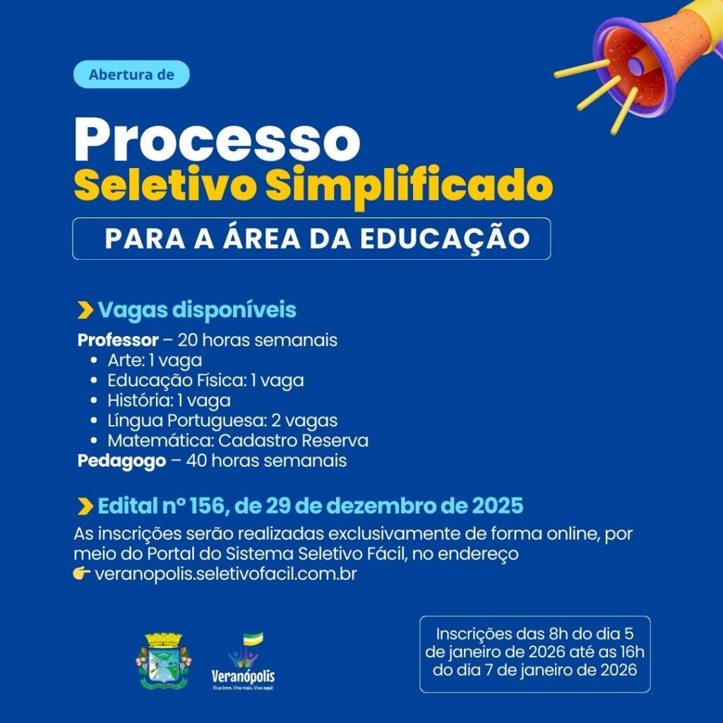 A Prefeitura de Veranópolis publicou o Edital nº 156, de 29 de dezembro de 2025, que dispõe sobre a abertura de processo seletivo simplificado para contratação de profissionais da área da Educação.