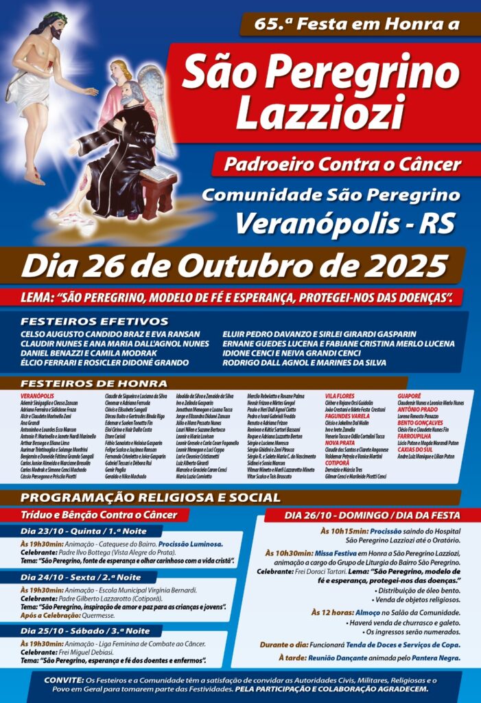 A comunidade São Peregrino, de Veranópolis, se prepara para celebrar a 65.ª Festa em Honra a São Peregrino Laziosi, padroeiro contra o câncer. O evento religioso e social acontece no dia 26 de outubro de 2025, com o lema “São Peregrino, modelo de fé e esperança, protegei-nos das doenças.”