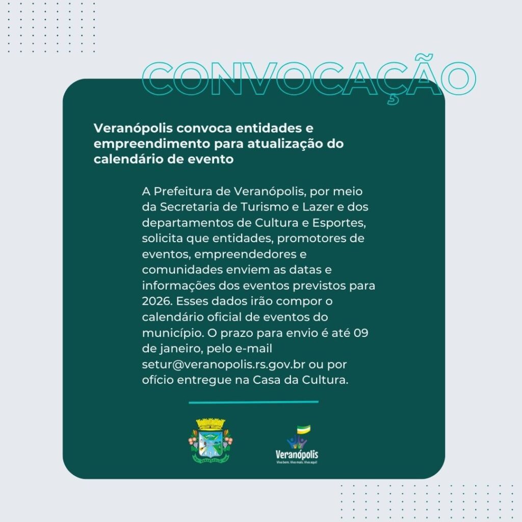 A Prefeitura de Veranópolis, através da Secretara de Turismo e Lazer e Departamentos de Cultura e de Esportes, convida todas as entidades, promotores de eventos, empreendedores e comunidades do município a entrarem em contato e informarem as datas e detalhes dos eventos programados para o ano de 2026.