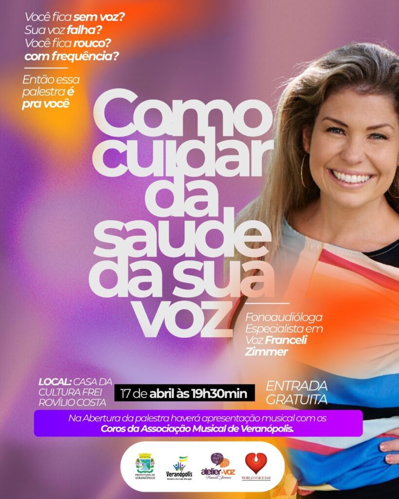 Veranópolis será palco de uma importante ação em alusão ao Dia Mundial da Voz, integrando o movimento internacional World Voice Day. O município promove, na sexta-feira, dia 17 de abril, uma palestra gratuita voltada à conscientização sobre os cuidados com a saúde vocal.