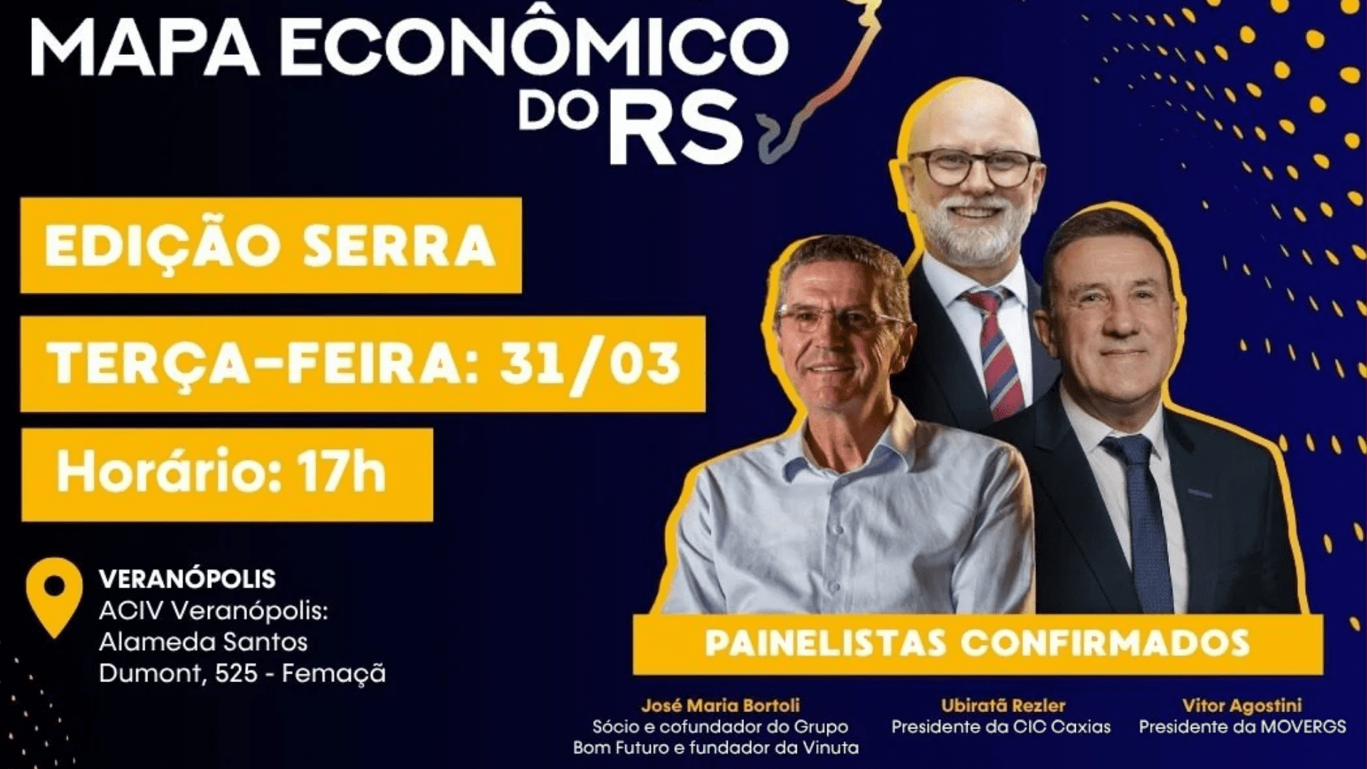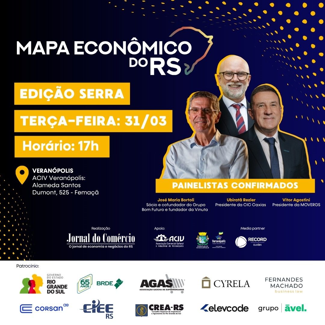 A economia da Serra Gaúcha e regiões vizinhas estará em pauta nesta terça-feira, dia 31 de março, em Veranópolis. A sede da ACIV recebe o encontro que abre a 4ª temporada do projeto Mapa Econômico do RS, realizado pelo Jornal do Comércio.