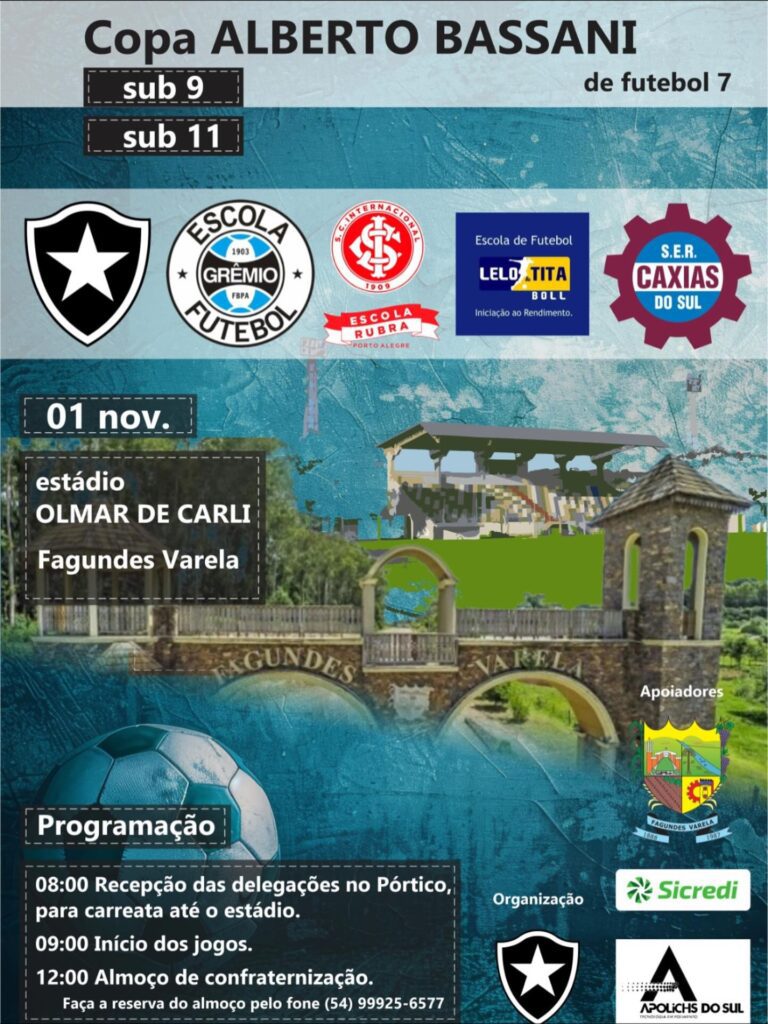 Fagundes Varela será sede da Copa Alberto Bassani de Futebol 7 neste sábado, 1º de novembro, no Estádio Olmar de Carli. A competição reúne as categorias Sub-9 e Sub-11. Participam do torneio as equipes do Botafogo, Grêmio, Internacional, SER Caxias e Escola de Futebol Lelo & Tita Boll.