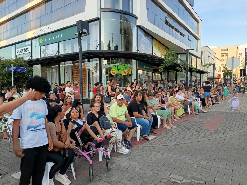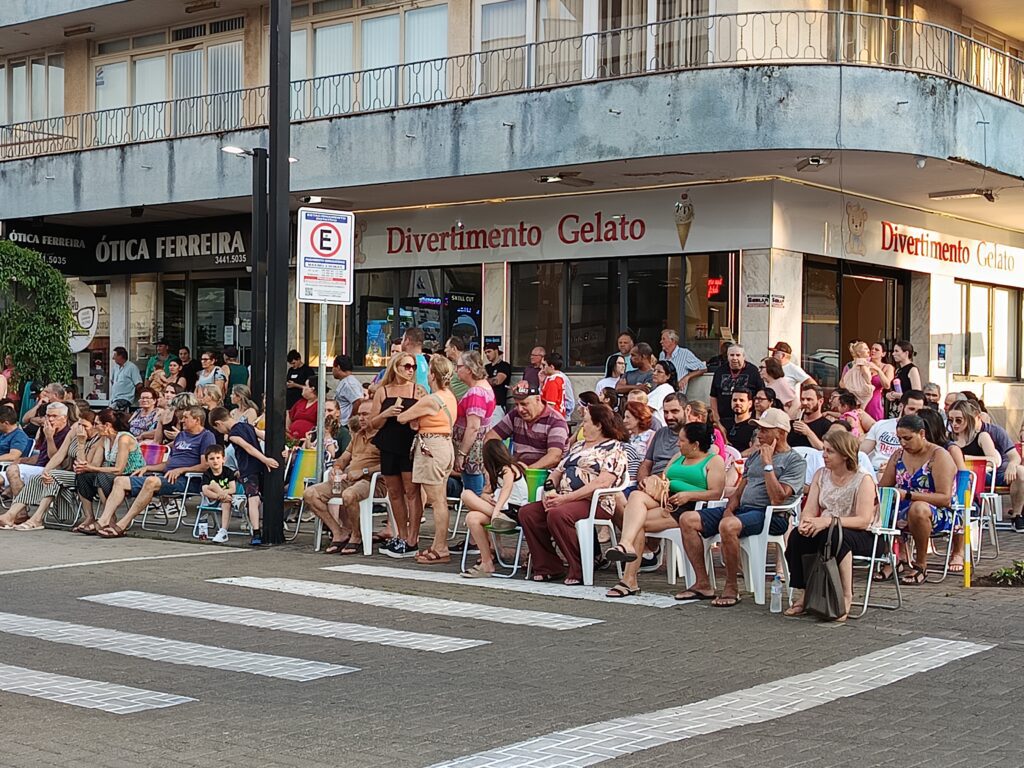A saída ocorreu nas proximidades do cruzamento com a Rua Júlio de Oliveira, e o ponto alto da noite concentrou-se na Praça XV de Novembro, onde o público se acomodou em cadeiras — muitas trazidas de casa, conforme o convite da organização — para acompanhar o desfecho do espetáculo. As ruas do entorno registraram alterações no trânsito, exigindo atenção redobrada dos motoristas.