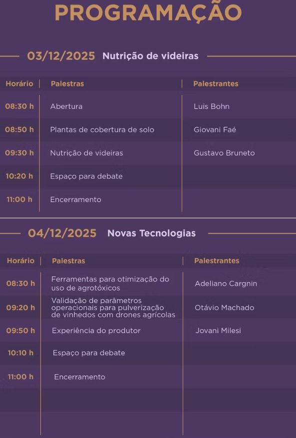 A programação da Tecnovitis 2025 foi organizada por temas, com palestras diárias pela manhã e demonstrações a campo durante todo o evento.