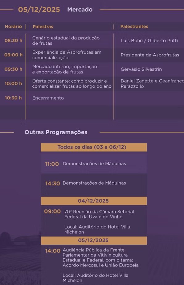 - 9h30 – Mercado interno, importação e exportação de frutas, com Gervásio Silvestrin