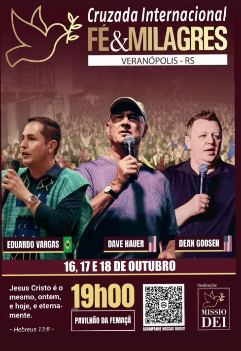 Entre os preletores confirmados estão Eduardo Vargas (Brasil), Dave Hauer (EUA) e Dean Goosen (EUA), que trazem uma mensagem de esperança, cura e transformação espiritual. O encontro é promovido pela Missio Dei, com base no versículo de Hebreus 13:8: “Jesus Cristo é o mesmo, ontem, e hoje, e eternamente.”