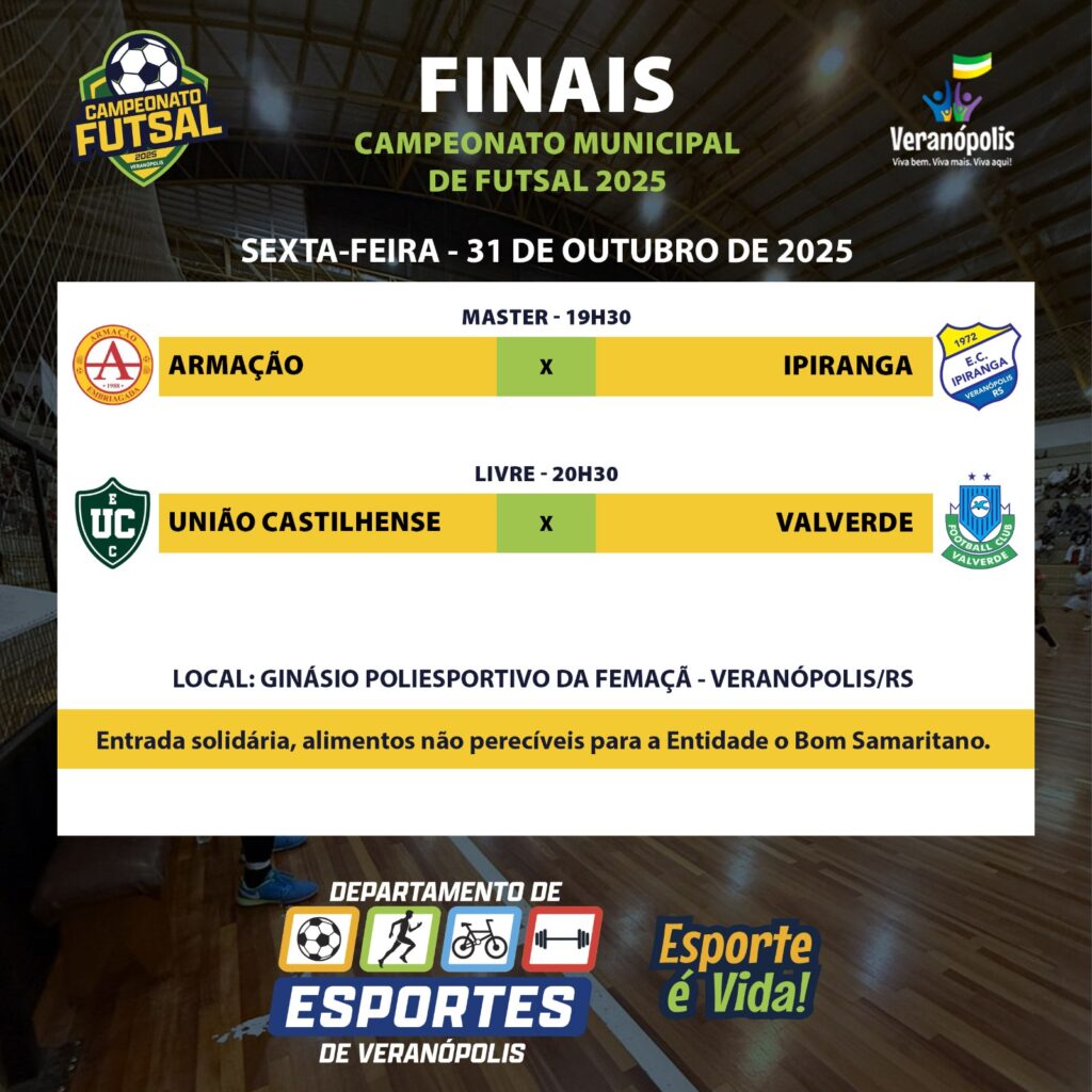 As decisões continuam nesta sexta-feira, 31 de outubro, novamente no Ginásio Poliesportivo Leonir Antônio Farina. As partidas que encerram o campeonato serão as finais das categorias Master, entre Armação e Ipiranga, às 19h30, e Livre, entre União Castilhense e Valverde, às 20h30, prometendo mais uma noite de grandes jogos e muita torcida. A KOM FM e TV transmite em áudio e vídeo.