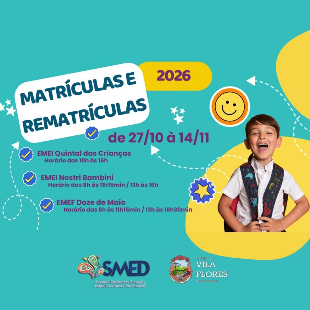 A Secretaria Municipal de Educação, Desporto e Lazer informa que o período de matrículas e rematrículas da Educação Infantil e do Ensino Fundamental na rede municipal será de 27 de outubro a 14 de novembro de 2025.