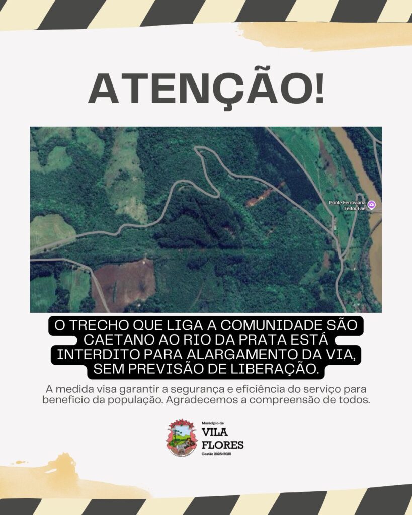 A Prefeitura de Vila Flores interditou temporariamente o trecho da estrada que liga a Comunidade de São Caetano ao Rio da Prata. A medida, anunciada pela Secretaria de Obras e Trânsito, é necessária para a execução de obras de alargamento da via.