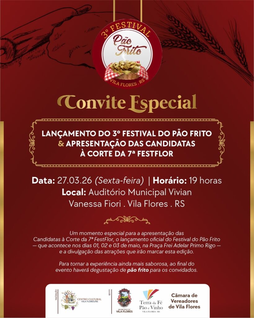 A Prefeitura de Vila Flores convida a comunidade para o lançamento oficial do 3º Festival do Pão Frito, que acontecerá na sexta-feira, dia 27 de março de 2026, às 19 horas, no Auditório Municipal Vivian Vanessa Fiori.