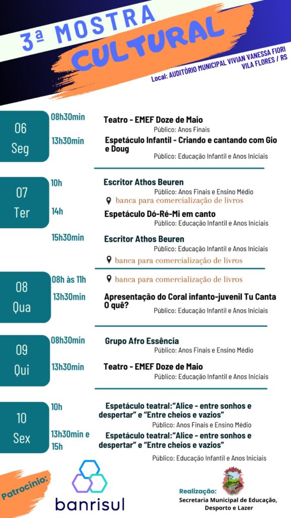 De 06 a 10 de outubro, o Auditório Municipal Vivian Vanessa Fiori será palco da 3ª Mostra Cultural de Vila Flores, evento que promete movimentar a cidade com uma programação rica em arte, cultura e emoção para todas as idades.
