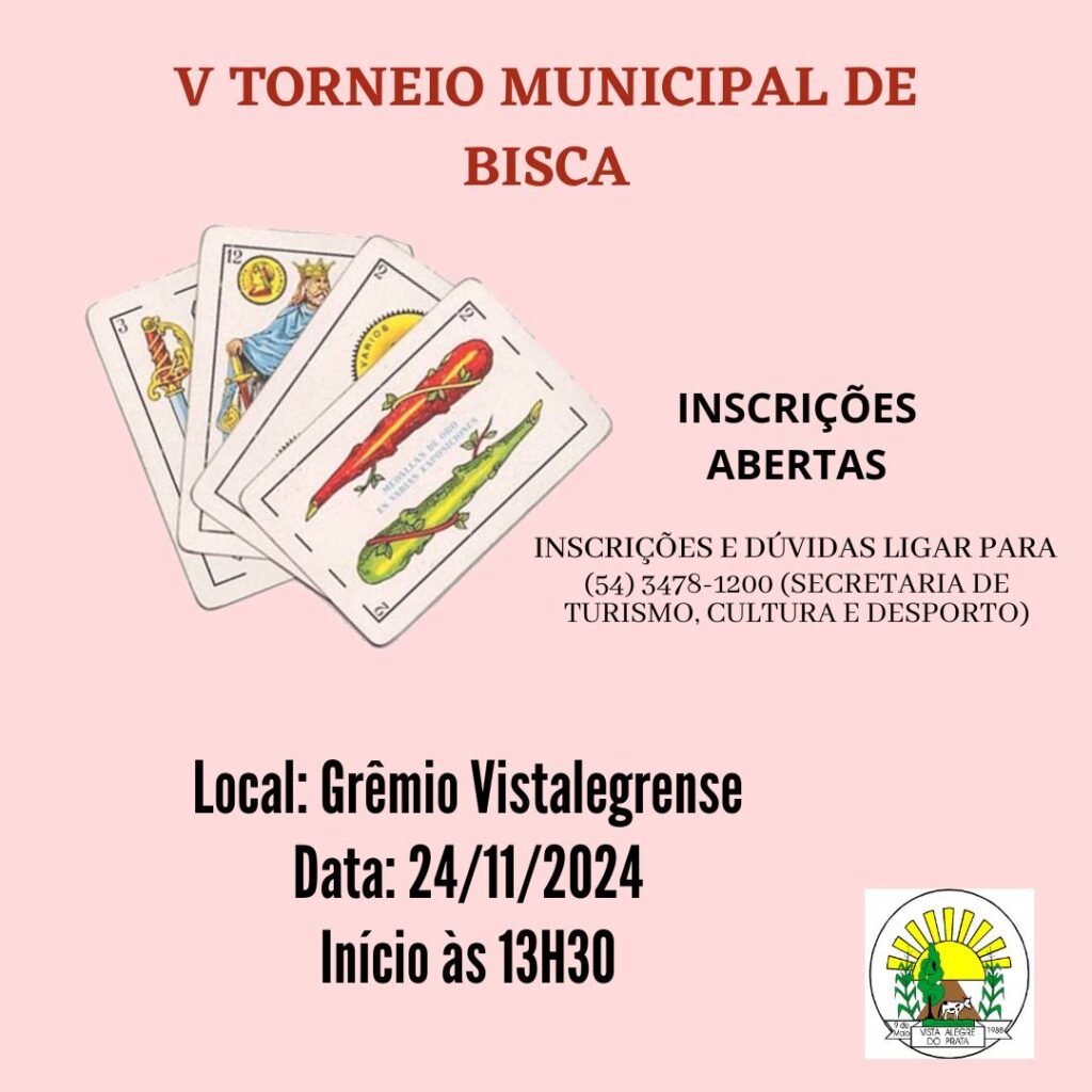 O V Torneio Municipal de Bisca de Vista Alegre do Prata ocorrerá no Grêmio Esportivo Vistalegrense no domingo, dia 24 de novembro de 2024. As atividades terão início às 13h30.